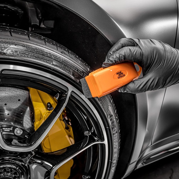Da biste nastavili sa nanošenjem premaza za gume, potrebno je da uklonite plastični element koji drži sunđer. Uhvatite plastičnu glavu aplikatora i izvucite je iz poklopca. Postavite sigurnosni uređaj na bezbedno mesto. Zatim okrenite aplikator sa sunđerom. Ravnomerno nanesite odgovarajuću količinu premaza za gume na sunđer.