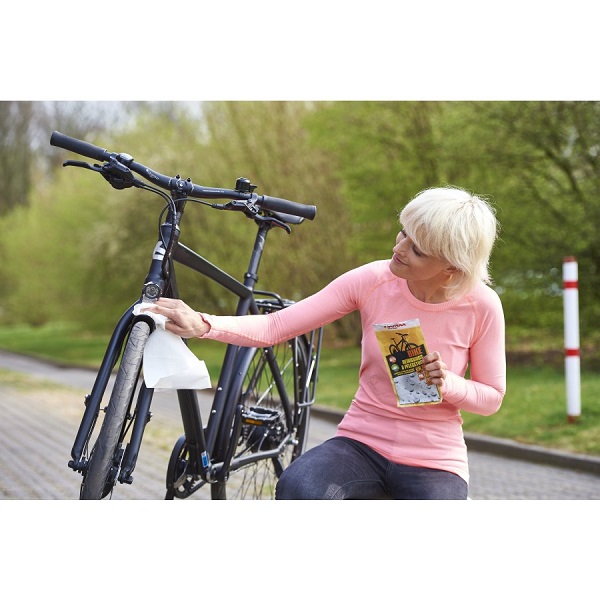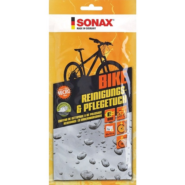 SONAX BIKE krpa za čišćenje i negu bicikala, održava i štiti sve delove na biciklu, dermatološki testirano, pogodna za e-bicikle, kompatibilna sa svim materijalima na biciklu, štiti od uticaja okoline i vremenskih uslova.