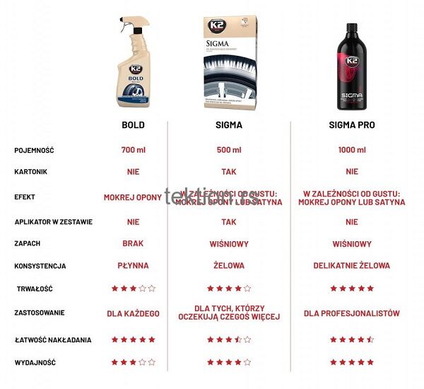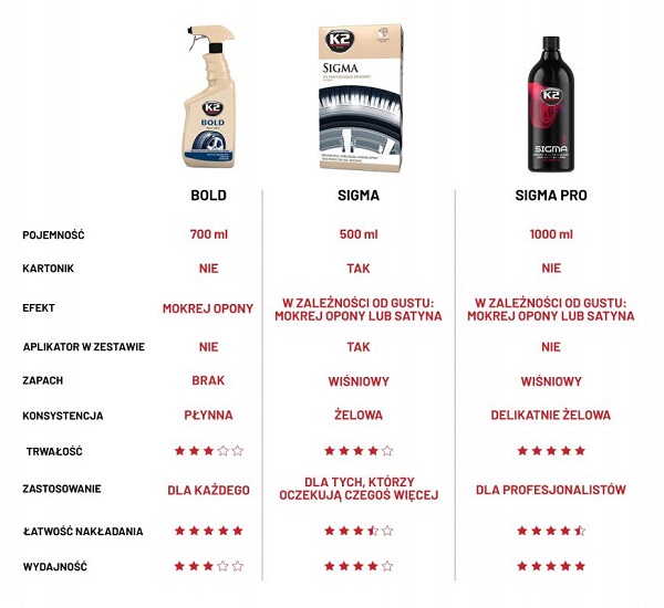 Sjajni i zaštitni premaz za gume K2 SIGMA PRO je kreiran da impresionira korisnika rezultatom i da gumi pruži savršen izgled, a istovremeno je štiti od tamnjenja, pucanja i starenja. Vodoodbojni premaz na gumenoj površini štiti od vremenskih uticaja i zagađenja sa puteva.