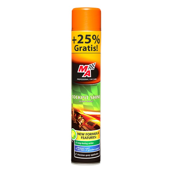 MA Cockpit Shine sprej za čišćenje i održavanje instrument table i ostalih plastičnih delova u automobilu. Dugotrajno dejstvo. Prijatan miris, bez mirisa benzina. Precizno nanošenje.