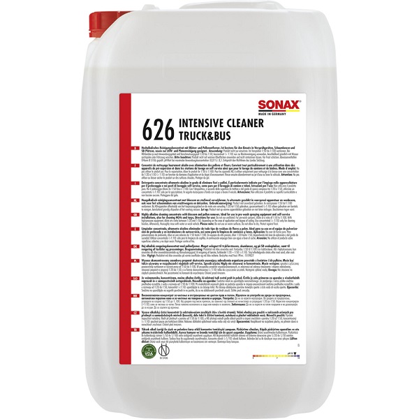 Sonax intensive cleaner truck+bus 626 aktivna pena. Univerzalno primenjiv alkalni deterdžent. U automatskim instalacijama za pranje automobila, može se koristiti kao pena, šampon, četkica za čišcenje (takođe i tekstilne četke), sredstvo za čišcenje felni i kotalicu za čišcenje. Uklanja sve vrste prljavštine, uključujući i mast i ulje, brzo, temeljito i bez ostataka. Idealan za upotrebu u opremi za prskanje i u samoposlužnim uređajima za pranje. Može se koristiti kao sredstvo za čišcenje u koncentrovanom obliku (1: 1 do 1: 5).