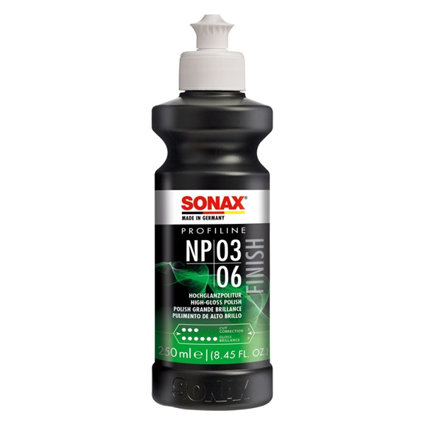 Sonax ProfiLine NP 03-06 sredstvo za fino nanopoliranje nežno vraća sjaj novoj i lagano izbledeloj boji. Brzo i lako daje savršeni visok sjaj. Boje otporne na grebanje mogu se polirati, profesionalno i bez holograma. Ne sadrži vosak ili silikon. Srednji abrazivni efekat.
