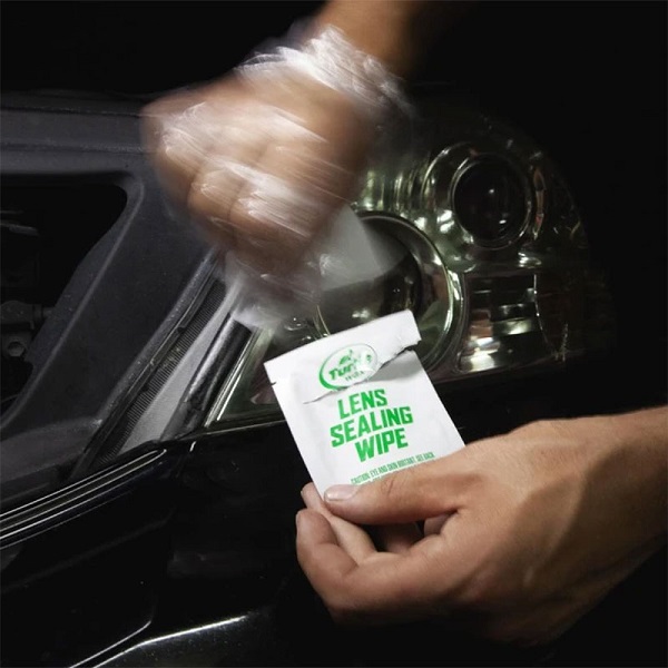 3. Nakon šmirglanja krpom ponovo naneti Headlight Lens Repair & Renew Compound na far i polirati 30 sekundi jačim pritiskom. Suvom, pamučnom krpom ukloniti višak do visokog sjaja. Pre poslednjeg koraka, nanošenja zaštitnog sloja pomoću Ceramic akrilnih maramica, restaurirati oba fara. Koristeći rukavice iz seta, otvoriti jedno pakovanje keramičkih akrilnih maramica i brzo premazati oba fara potezima napred – nazad. Ostaviti 3 do 5 minuta da se farovi osuše. Keramički premaz će se potpuno stvrdnuti za 24 sata.