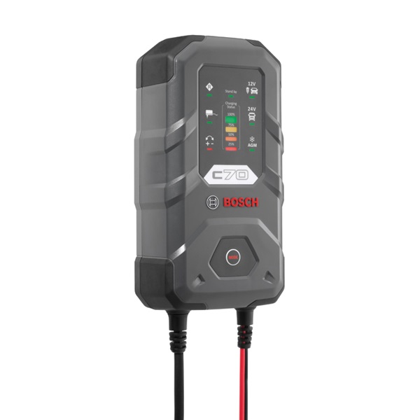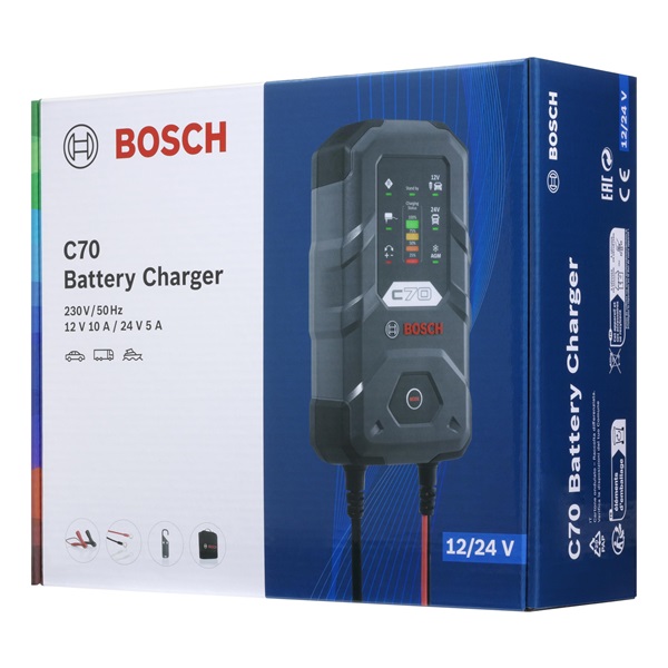 Punjač akumulatora Bosch C70 je jedinstven po tome što može da puni baterije od 12 i 24V. Ako punite akumulator od 12V, njen kapacitet može biti od 14 - 300Ah, u slučaju baterije od 24V od 14 - 120Ah.