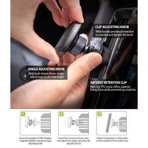 Magnetni držač sadrži 4 komada n45 magneta koji mogu bezbedno da drže vaš uređaj. Može se lako ugraditi u debeli i tanki vazdušni otvor bez oštećenja jer kandža ima različitu širinu. Rotacija za 360°. Telefon možete postaviti pod bilo kojim uglom kako biste izbegli blokiranje prikaza. Uživajte u svojoj sigurnoj vožnji.