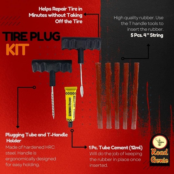 Set uključuje lepak za gumu od 12 g, 5 traka za popravku, utiskivač za gume sa T-ručkom i razvrtač za gume sa T-ručkom.