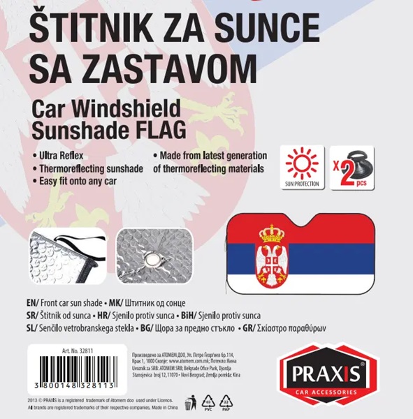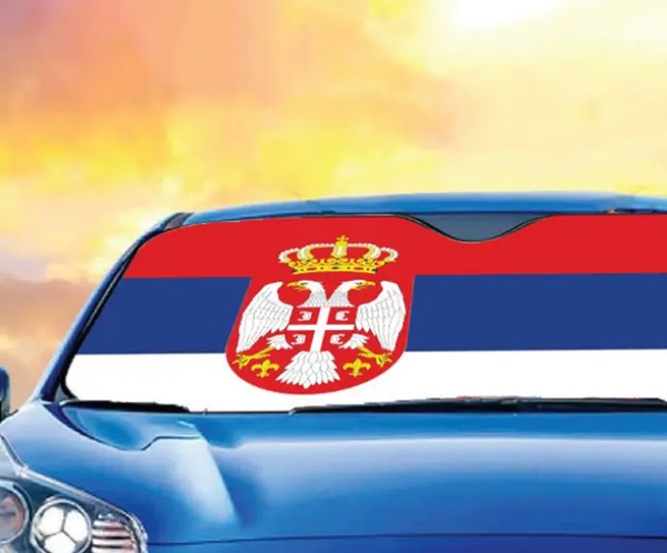 Dvostrana zaštitna folija za prednje staklo automobila sa odštampanim motivima srpske zastave.