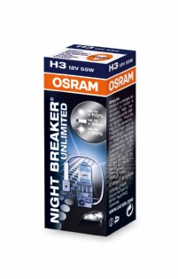 Auto sijalica Osram Night Breaker Unlimited 12V H3 55W je unapređena halogena auto sijalica koja daje do 110% više svetlosti na putu u odnosu na standardne halogene sijalice, odnosno do 35m duži snop svetlosti. Svetlost je belja za 20% u odnosu na standardne lampe. Zahvaljujući ovim unapredjenjima vozač ima više vremena za uočavanje prepreka na putu. Optimalno svetlo za više vremena reakcije. Patentirani plavi premaz prstena sijalice, smanjuje refleksni odsjaj i pojačava efikasnost. Optimizovano napunjena gasom po novoj formuli punjenja, ova napredna sijalica pravi je izbor za vaše vozilo.