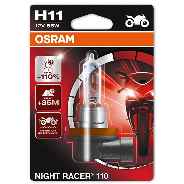 Moto sijalica Osram Night Racer 110 12V H11 55W je unapređena halogena sijalica za motocikle koja daje do 110% više svetlosti na putu u odnosu na standardne halogene sijalice, odnosno do 40 metara duži snop svetlosti. Svetlost je belja za 20% u odnosu na standardne lampe. Zahvaljujući ovim unapredjenjima vozač ima više vremena za uočavanje prepreka na putu. Optimalno svetlo za više vremena reakcije. Patentirani plavi premaz prstena sijalice, smanjuje refleksni odsjaj i pojačava efikasnost. Otporna na vibracije. Sijalica ima UV filter, kao i sertifikat kvaliteta ECE R37.